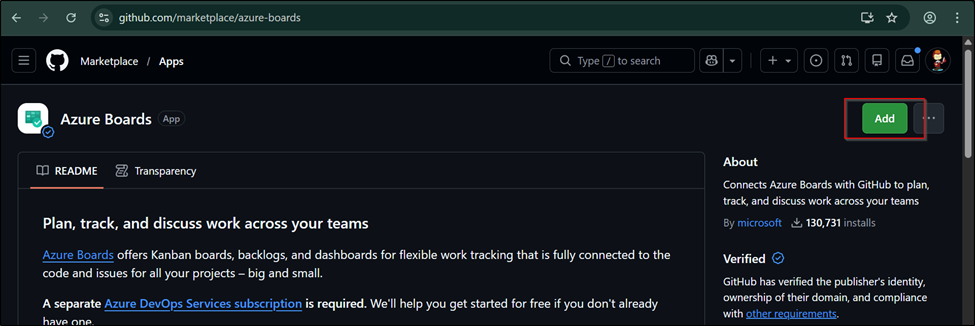 Navigate to the Marketplace in the GitHub and Search for Azure Boards.